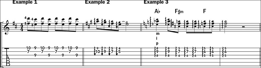 Wariner: And Paul Yandell. Emmanuel: He was the last one. Wariner: He did kind of recuse himself. Emmanuel: It was Paul who told Chet he should give the CGP to me. Wariner: Probably in my case, too. Paul deserves a lot of credit. What do you hear in Jerry’s music that shows both those Chet Atkins roots and his journey beyond them toward his own unique style? Emmanuel: I definitely hear early Chet in his playing. He could actually emulate Chet better than any of us. He could emulate Travis really well, too. But Jerry Reed was trying to be like Ray Charles. That’s what set him apart in his playing. He came from a whole different perspective. He eventually evolved into his own unique style, which was based on piano licks. Wariner: And you’ve got to remember that Jerry was a session guy. Then Chet started telling him, “You need to make your own records.” Many times I’d brag on Jerry’s guitar playing and he’d say, “Hey, I’m a songwriter, man.” Or I’d brag on his writing and he’d say, “Man, I’m a guitar player.” [laughter] Emmanuel: I did something to Jerry that I did to Chet as well, which was to get them to play. The first thing they’d say was, “I’ve stopped playing.” So you’d play something of theirs in front of them… and you’d do it wrong. [laughter] And Jerry would be like, “OK, let me show you how to do it.” And once he’d play, I saw the experience in his hands. I saw a lifetime of work in two bars. Wariner: I didn’t know Jerry that well, but after Chet passed away, the night before his service, Jerry called me out of the blue. And we talked… Well, he talked for 45 minutes about Chet. I’d give anything if I’d been able to record it. He just poured his soul out to me about Chet. We got to be really close after that. Like Jerry, each of you built an original approach to guitar on a foundation laid for you by Chet and his work. Emmanuel: Well, when I was young, I was totally into singers and songwriters—Stevie Wonder, James Taylor, Neil Diamond. It turned out they influenced a lot of my songs. But I could also work with this technique I had on guitar. For instance, I wrote a tune called “Son of a Gun” with a bridge that Travis or Chet would never have written—and yet it’s based on their style [plays “Son of a Gun”]. Knowles: One more thing about learning from Chet but not sounding just like him. For me, there are two things. The first is, when I studied classical guitar for about four years, I had that same technique but I wasn’t playing with a thumb pick and I was changing the way my left hand worked. I met Chet right after I’d learned that. So I had Chet history, but nylon strings and more of a classical touch, which meant that we could work together without me feeling like I was a clone of his. The other thing is, when I would analyze his songs, it wasn’t just chord names. When a new idea or a new key came in [to one of Atkins’ songs], I would use them to compose things. You stole Chet’s ideas without stealing the licks. Wariner: Early on, when I was making singing records, Chet would say to me, “You need to find your own path. Don’t copy anybody.” A couple of my earlier records, even when Chet was producing me, sounded kind of Glen Campbell-ish, which was awesome. But Chet would say, “Be Steve Wariner. Don’t copy me or Glen or anybody.” That was huge because I was trying to be somebody else. I mean, there’s already one Chet Atkins! Why do a half-assed version of him? Emmanuel: Particularly to young people, I always say that I believe it’s nature’s way that we all start out emulating somebody. That’s true in any profession. Someone lights a fire in you. As an actor, Elvis Presley wanted to be like James Dean. Everybody wanted to be like Marlon Brando. So they learned. We didn’t want to be Chet Atkins but we couldn’t help but try to play what we were hearing because we loved it so much. Sleight of Hands In their time with Chet Atkins, Tommy Emmanuel, John Knowles, and Steve Wariner learned volumes from the master guitarist, much having to do with subtleties of fretting and picking technique. As Knowles demonstrates in Example 1, borrowed from Atkins’ tune “Happy Again,” fretting-finger economy makes for smooth, singing lines. Instead of the more conventional choice of sliding the dyads in a parallel manner along strings 1 and 3, Knowles stays in seventh position, with his first and third fingers anchored on strings 2 and 3, respectively, and his fourth finger sliding between frets 10 and 9 on string 1. When playing phrases with dyads, guitarists tend to play all the notes with equal weight, but as Emmanuel shows in Example 2, from Atkins he learned to do a series of double-stops with downward rakes, emphasizing the notes in the lower voice, a nuanced effect that recalls the Everly Brothers’ vocal harmonies. Knowles shows a trickier variation on this idea in Example 3. Atkins sometimes surrounded melodies with upper and lower harmonies, resulting in three-note block chords. To pull this off, Knowles picks the middle note of each chord first, with subtle emphasis, then quickly articulates the lower and higher members with his thumb and ring finger, respectively. This results in a beautiful, choir-like effect befitting of a CGP. —Adam Perlmutter Chet Do We Appreciate Since 1985, the Chet Atkins Appreciation Society has hosted its annual convention in Nashville. The first one drew around 70 attendees, including Atkins himself. Last year a few more than 1,000 checked in at the Music City Sheraton Hotel for the four-day festivities. They came from around the world and just down the road, guitar cases in hand. They roamed from workshop to workshop, took seats in the main auditorium to enjoy the world’s top fingerpickers in concert, or sprawled on floors or in the main lobby, playing together and trading technical tips. Mark Pritcher In the lobby, Mark Pritcher stood next to the